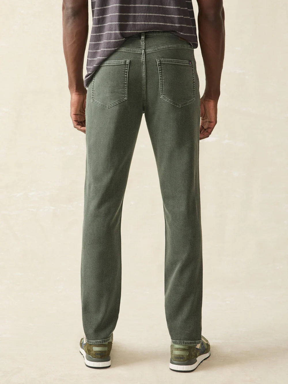 - Detail: Belt loops. Classic 5-pocket styling. Metal Rivets for pocket reinforcements. Metal fly zipper. Faherty logo back patch at wearer's right.