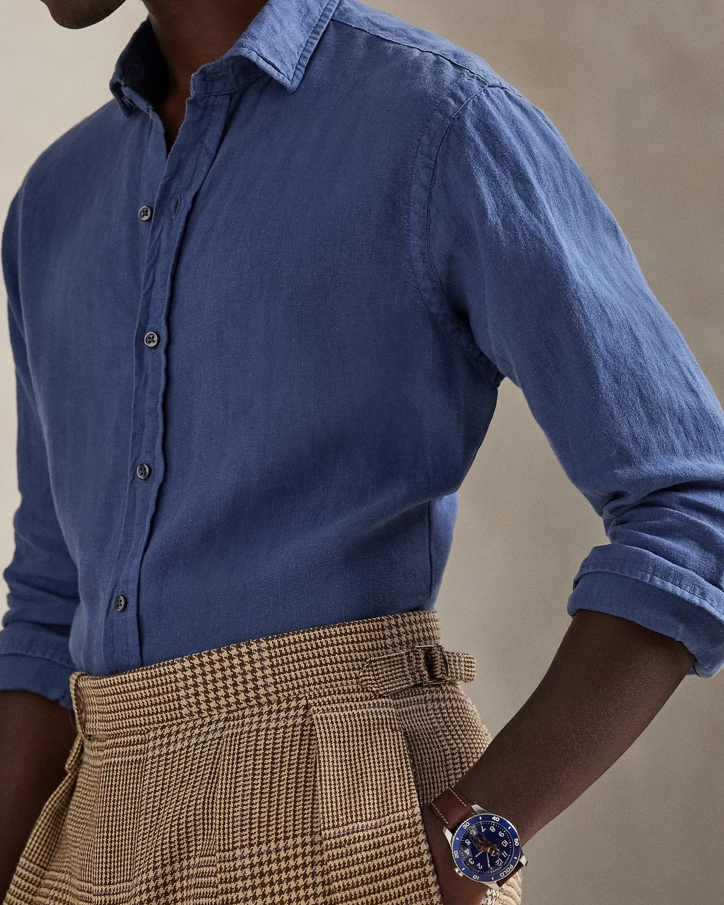 This spread-collar shirt is crafted with slub linen for subtle texture and a lightweight, breathable feel.