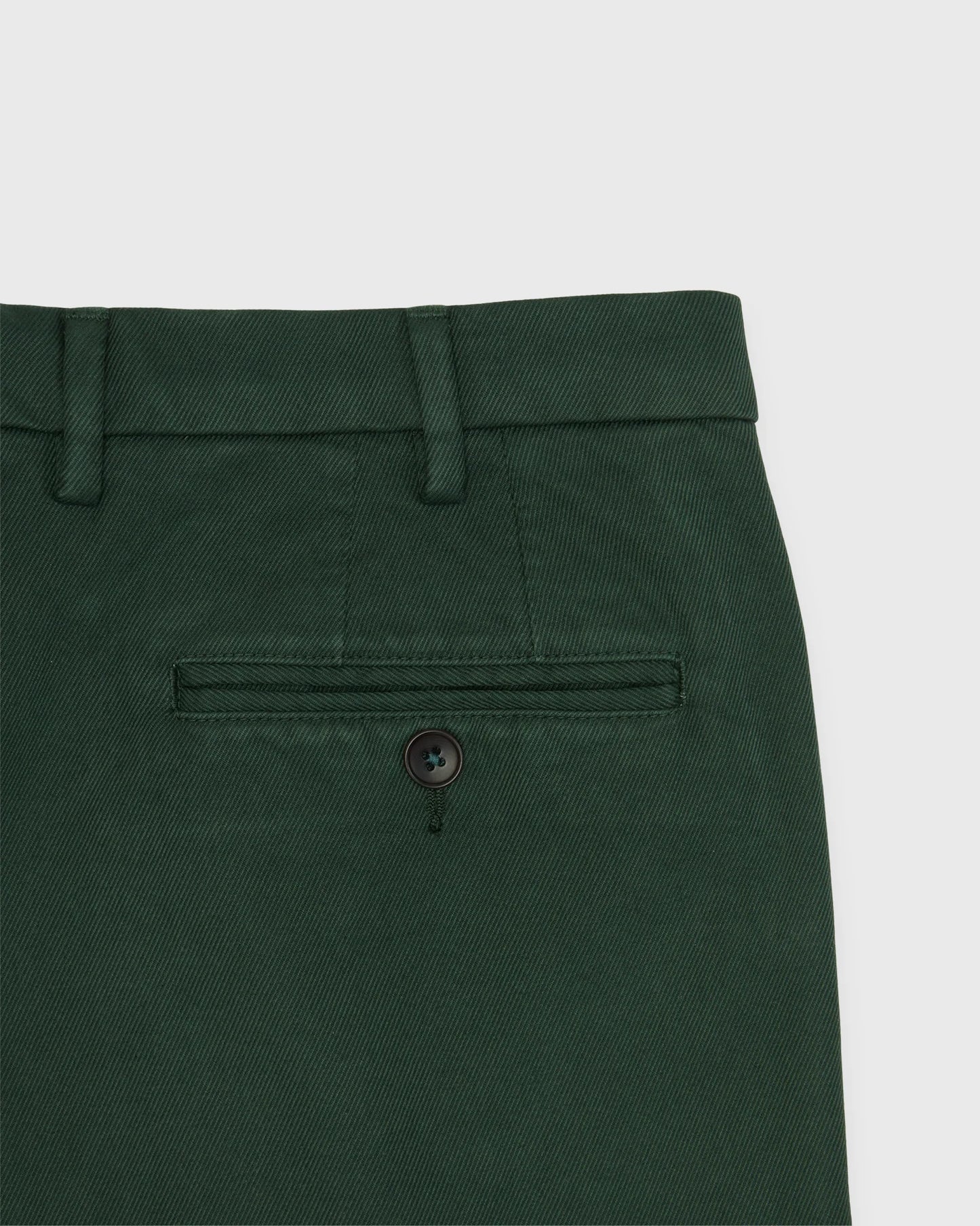 Our original, flat-front sport trousers are cut on the slimmer side for a tailored look without going too skinny. These are made from high ridge cotton twill, a fantastic three-season (fall through spring) fabric with a dry hand and a great tooth to it. Each pair has been garment-dyed to a deep, dark shade of spruce green — it gives the color a slightly lived-in, variegated quality from the get-go. They're made with corozo buttons, on-seam pockets, end-on-end pocketing, a split-back waist with our signature green bartack, and a 37.5" unfinished inseam that's ready to tailor to your perfect length.