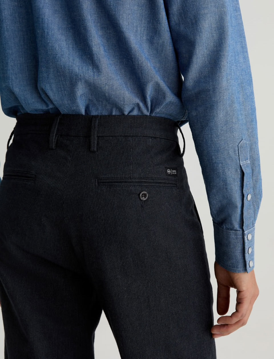 Archie is a straight-leg trouser crafted in our stretchy dark grey pinstriped cotton fabrication. Longer rise and an easy, relaxed fit through the hip and thigh. Finished with branded corozo buttons and jetted back pockets.